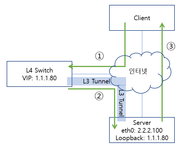 L4스위치와 Server가 서로다른 네트워크 대역에 존재하며 (예. 서로 다른 데이터센터), 이 때 L4스위치와 Server간 Tunnel을 맺어준다.