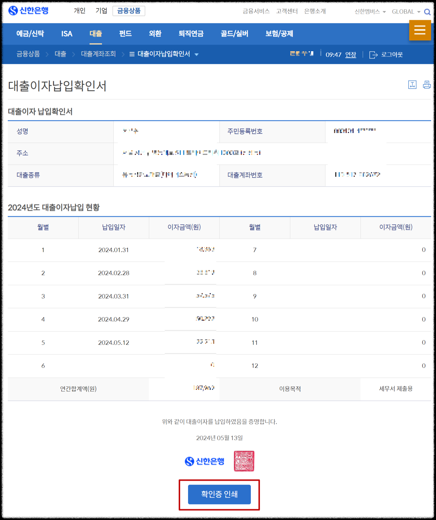 1. 신한은행 인터넷뱅킹 로그인 후, "대출이자납입확인서" 메뉴 진입