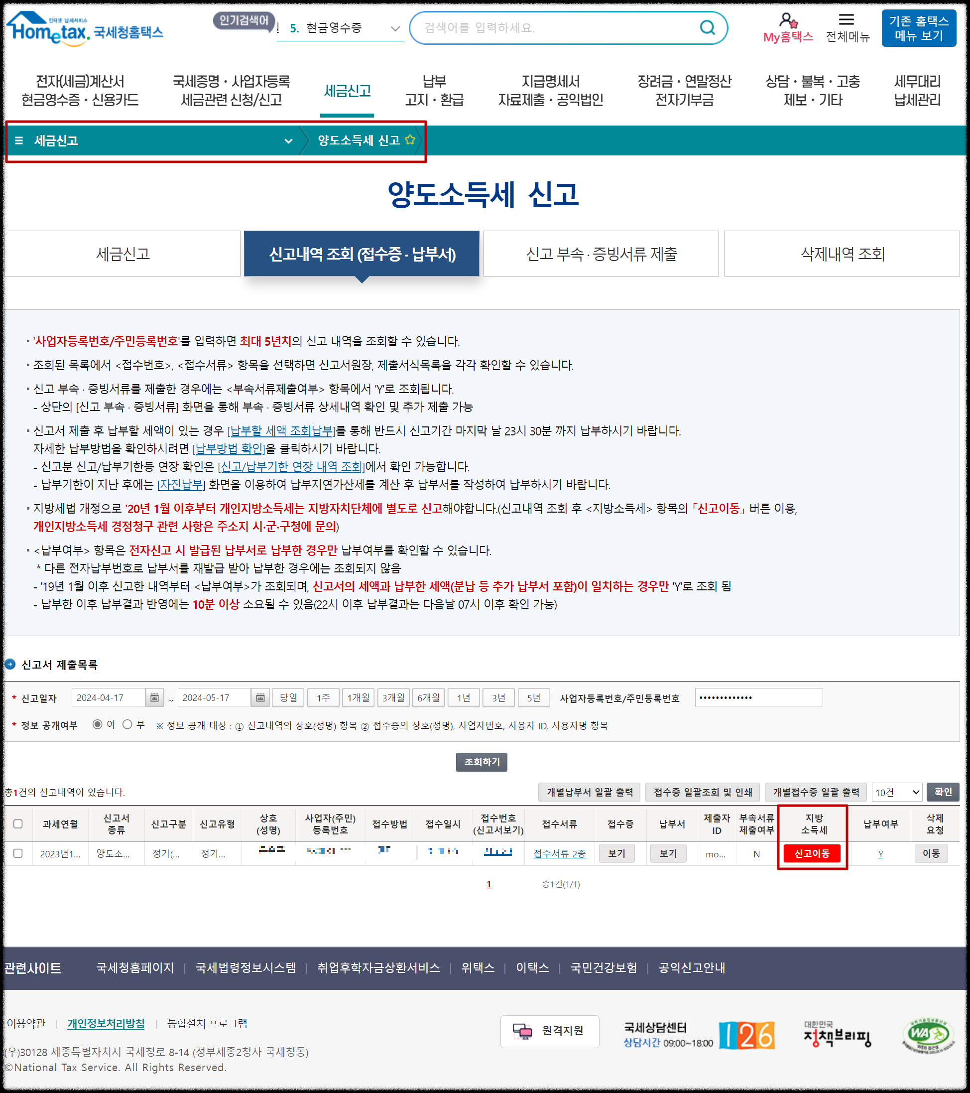 "세금신고-양도소득세신고-신고내역 조회" 메뉴를 확인하여 지방소득세 신고.