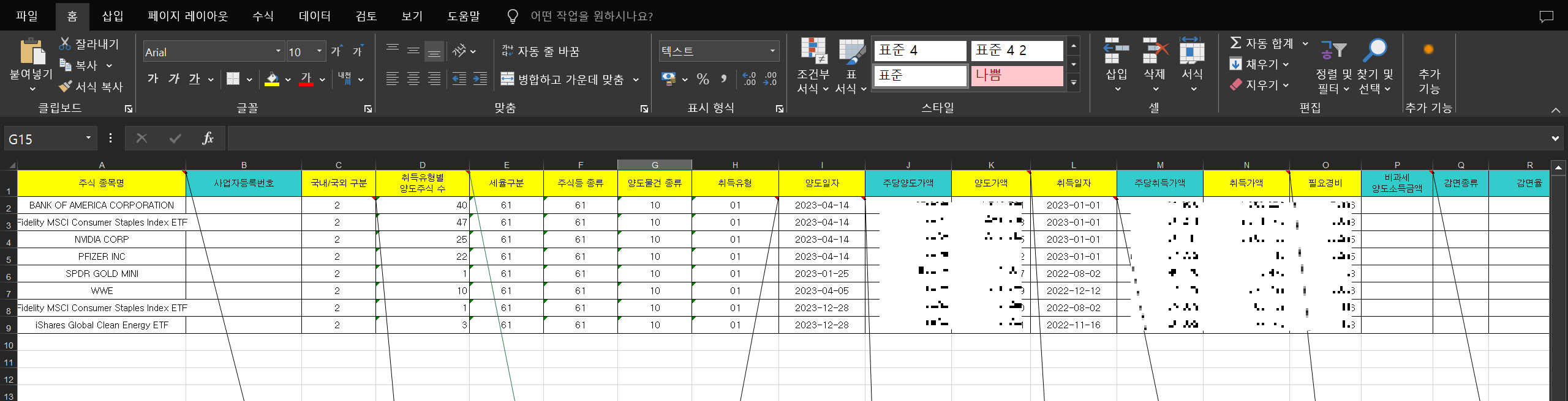 4. 각 주식별 양도소득 내용 입력. 주식수가 적으면 개별 입력하면 되지만, 주식수가 많으면 엑셀을 이용하여 업로드 한다.