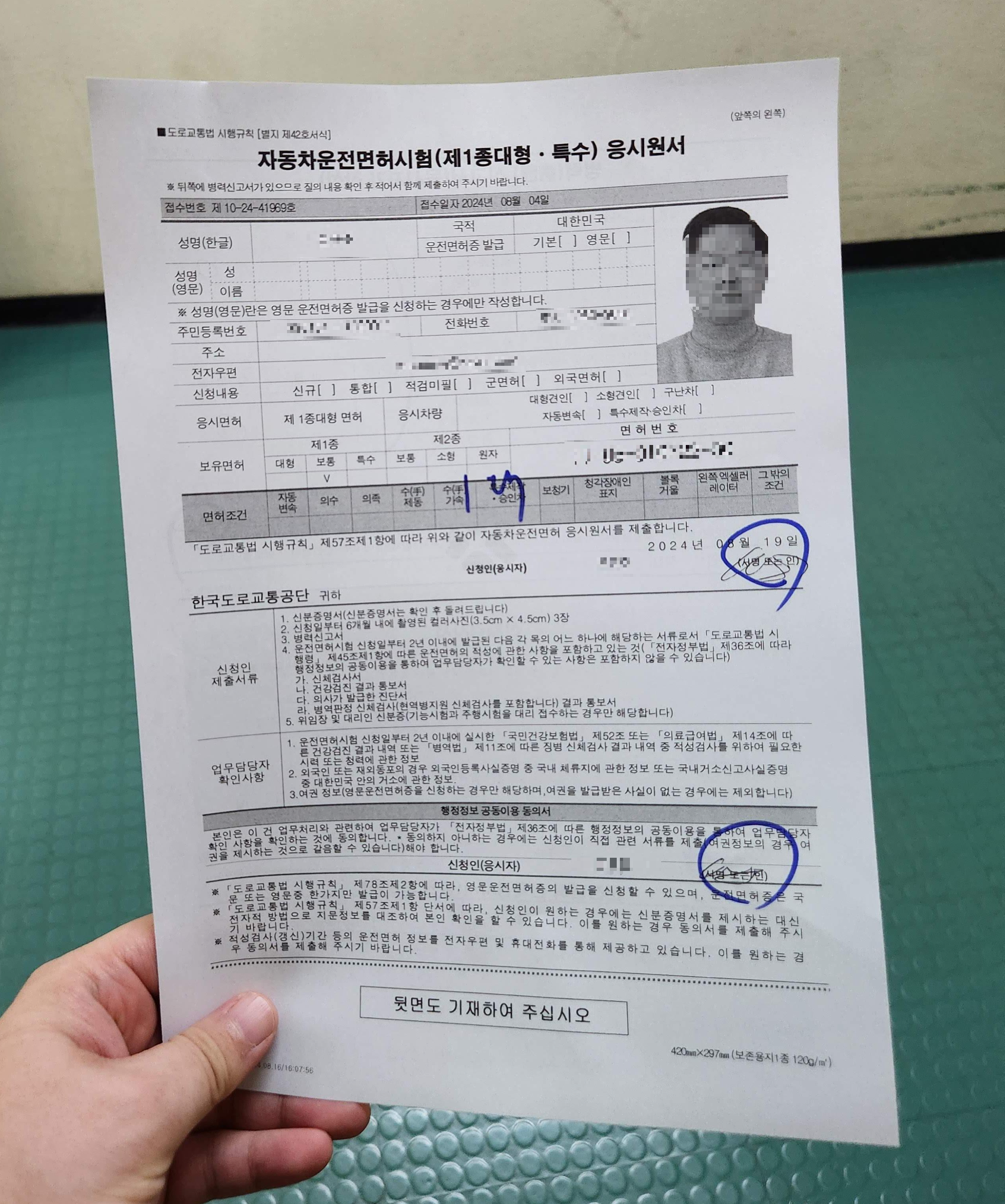이 후 1종대형면허로 면허증을 재발급 받으려면, 여권사진 규격으로 증명사진을 새로 인화하여 운전면허시험장에 방문해야 한다. (기존과 동일한 사진은 등록하지 못하며, 새로운 증명사진을 찍어서 방문해야 한다.)