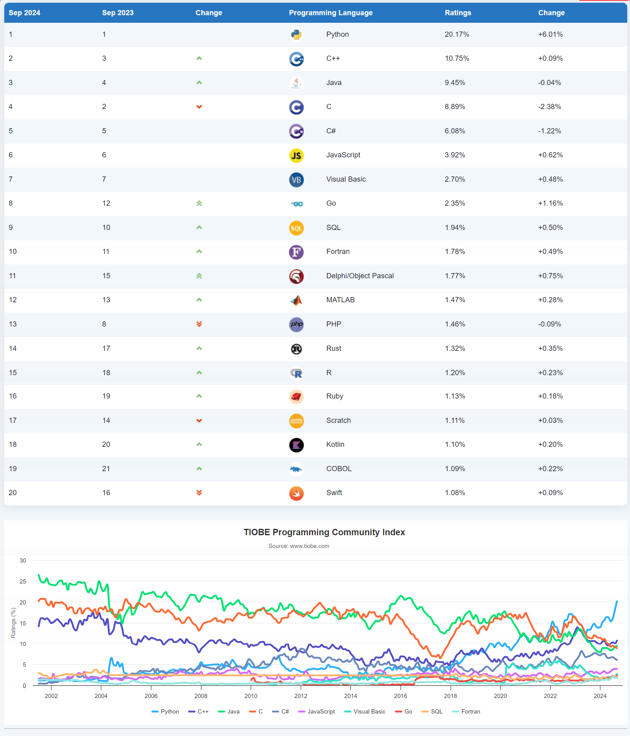 2024-09 현재 프로그래밍 언어 인기 순위는 다음과 같다.