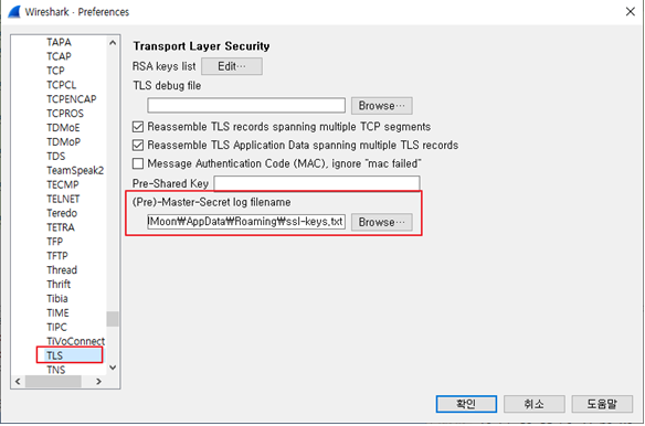 wireshark에 기록된 pre master key 등록