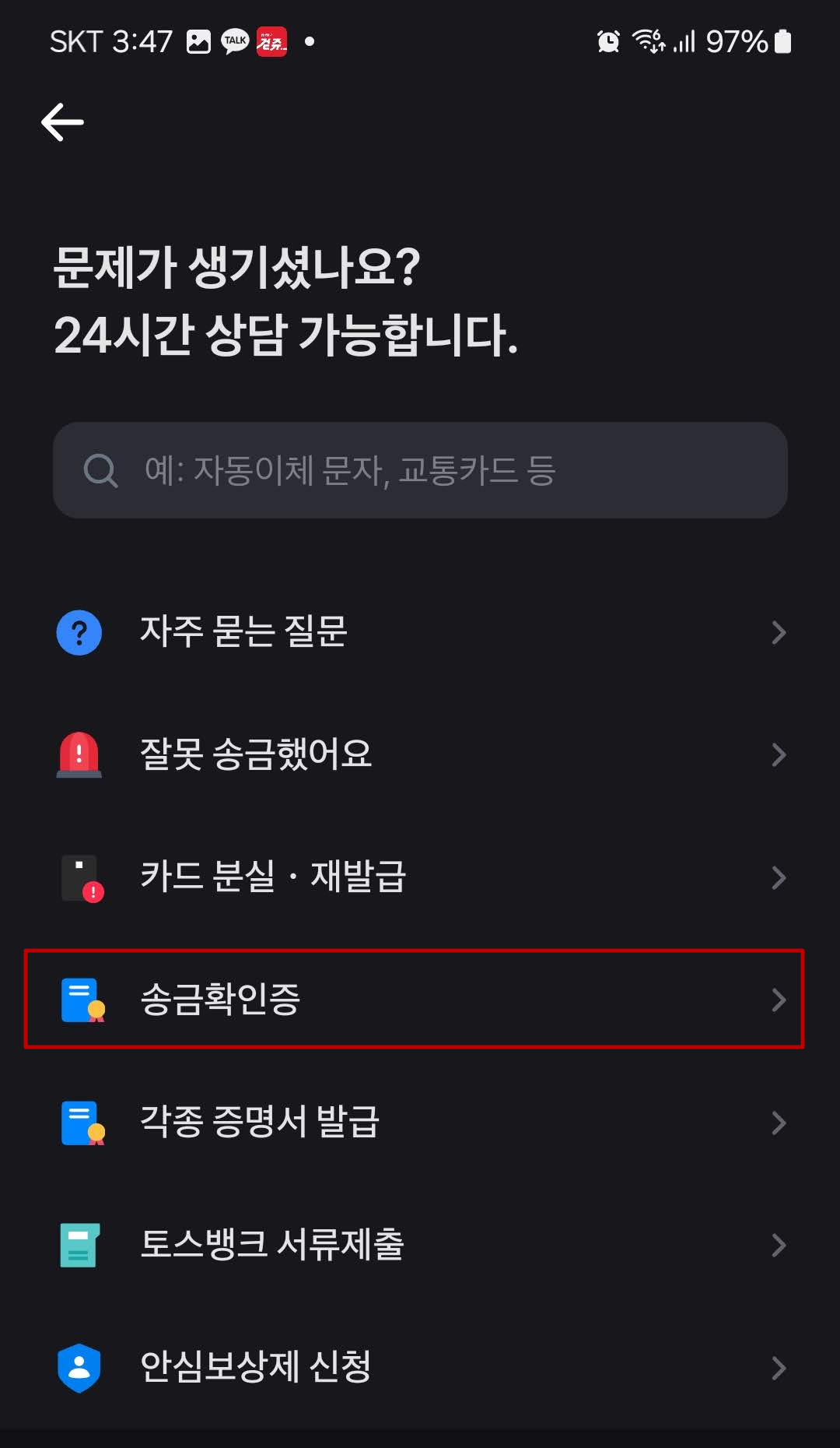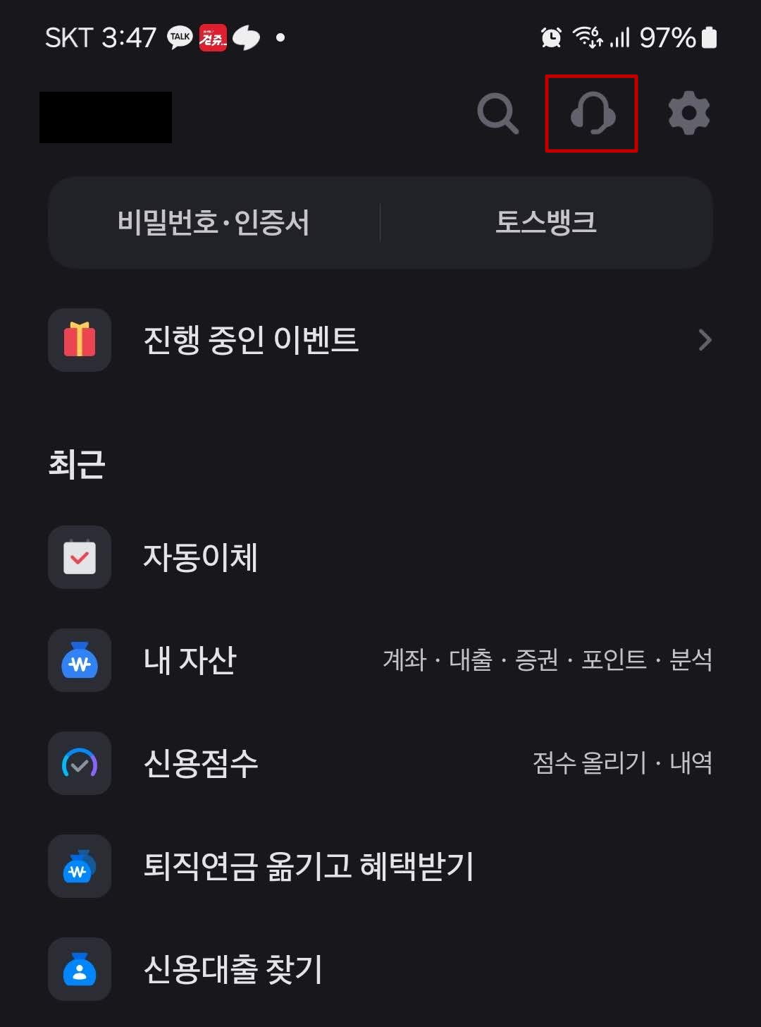 1. 토스뱅크의 '전체' → '고객센터(우측 상단 아이콘)' 진입