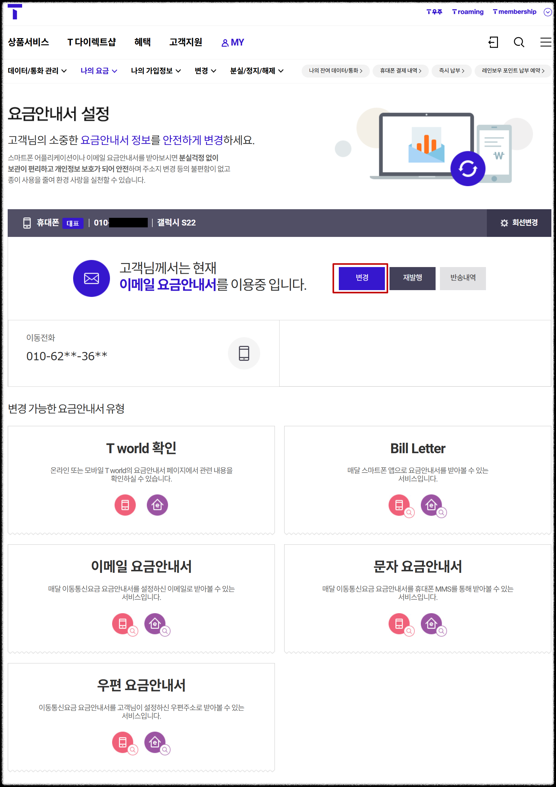 T world 확인 / Bill Letter / 이메일 요금안내서 / 문자 요금안내서 / 우편교금안내서 중 선택할 수 있다.