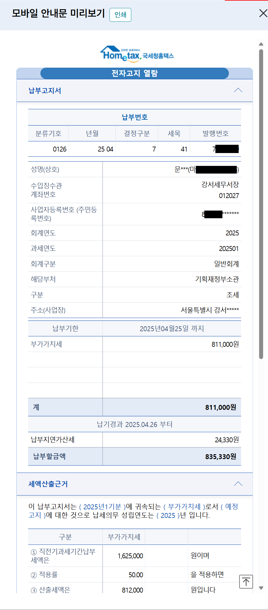 이번 4월에 2025년 1기 부가가치세 예납하는 과정을 기록해본다.