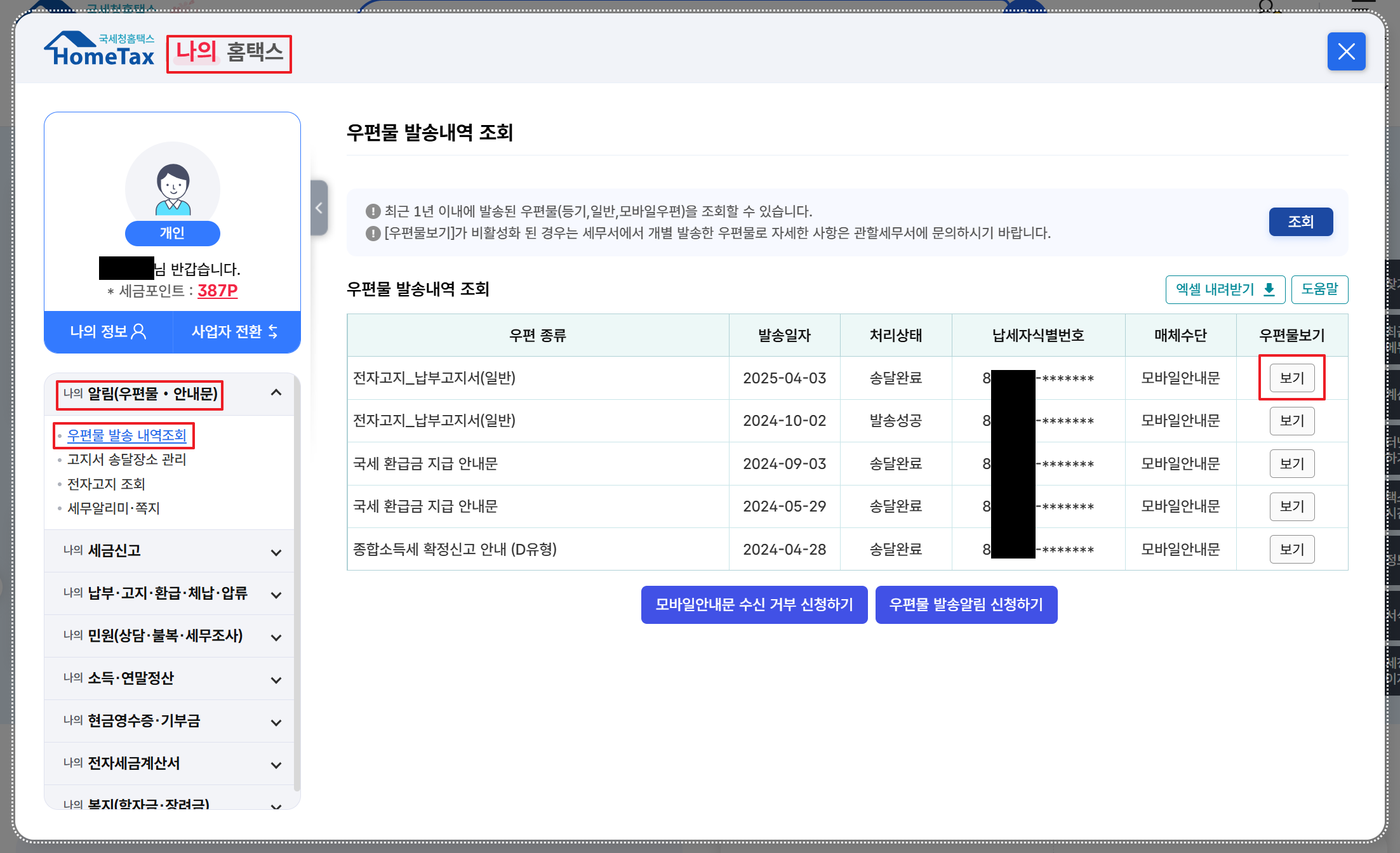 "나의 홈택스 - 나의 알림(우편물 안내문) - 우편물 발송 내역 조회"로 진입하면, 납부고지서를 확인할 수 있다.