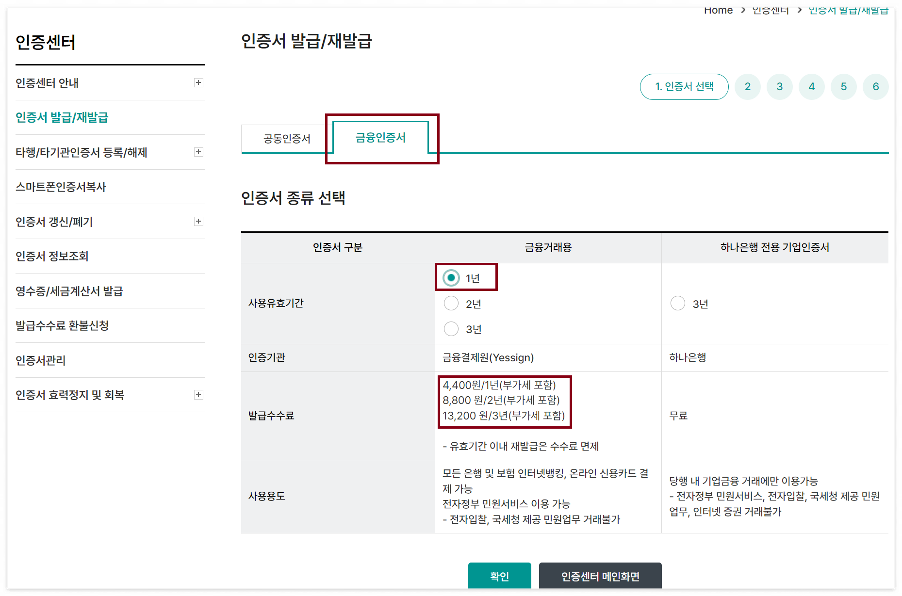 인증서 발급/재발급 페이지에서 금융인증서 옵션과 사용유효기간을 선택한다.
