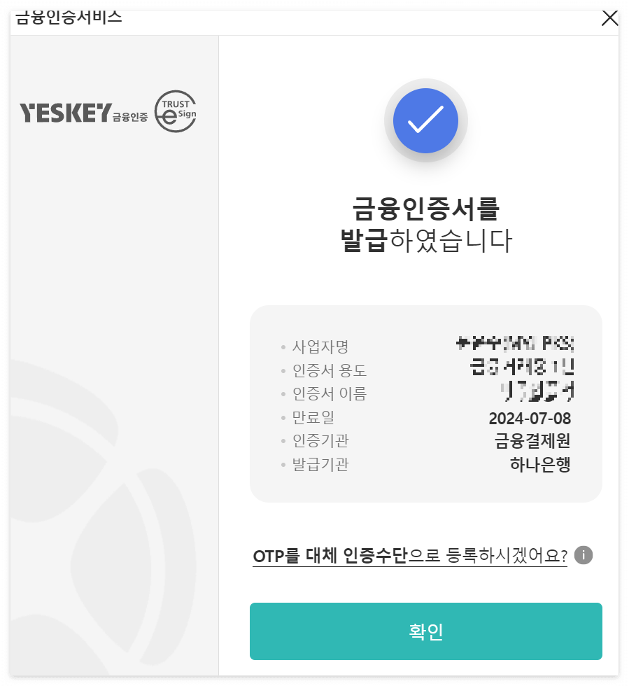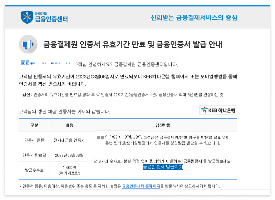 최종 4400원을 결제하면 금융인증서 발급이 완료된다.