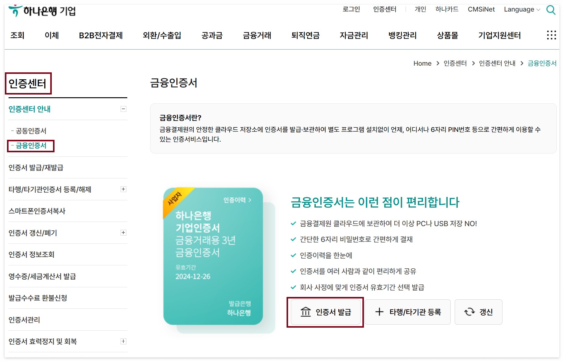 먼저 하나은행 기업용 페이지에 접속하여 금융인증서 발급 메뉴를 확인한다.