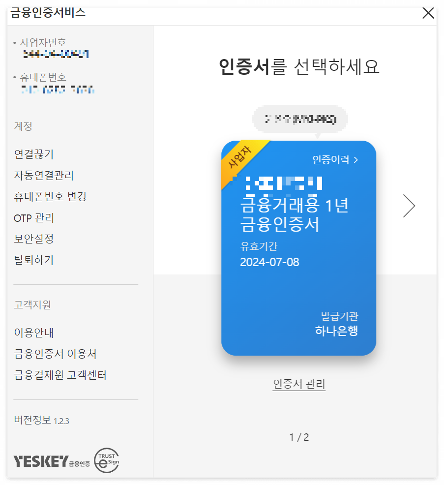 본인은 현재 기업용 뱅킹을 하나은행에서 하고있기 때문에, 하나은행에서 금융인증서를 발급하여였다.