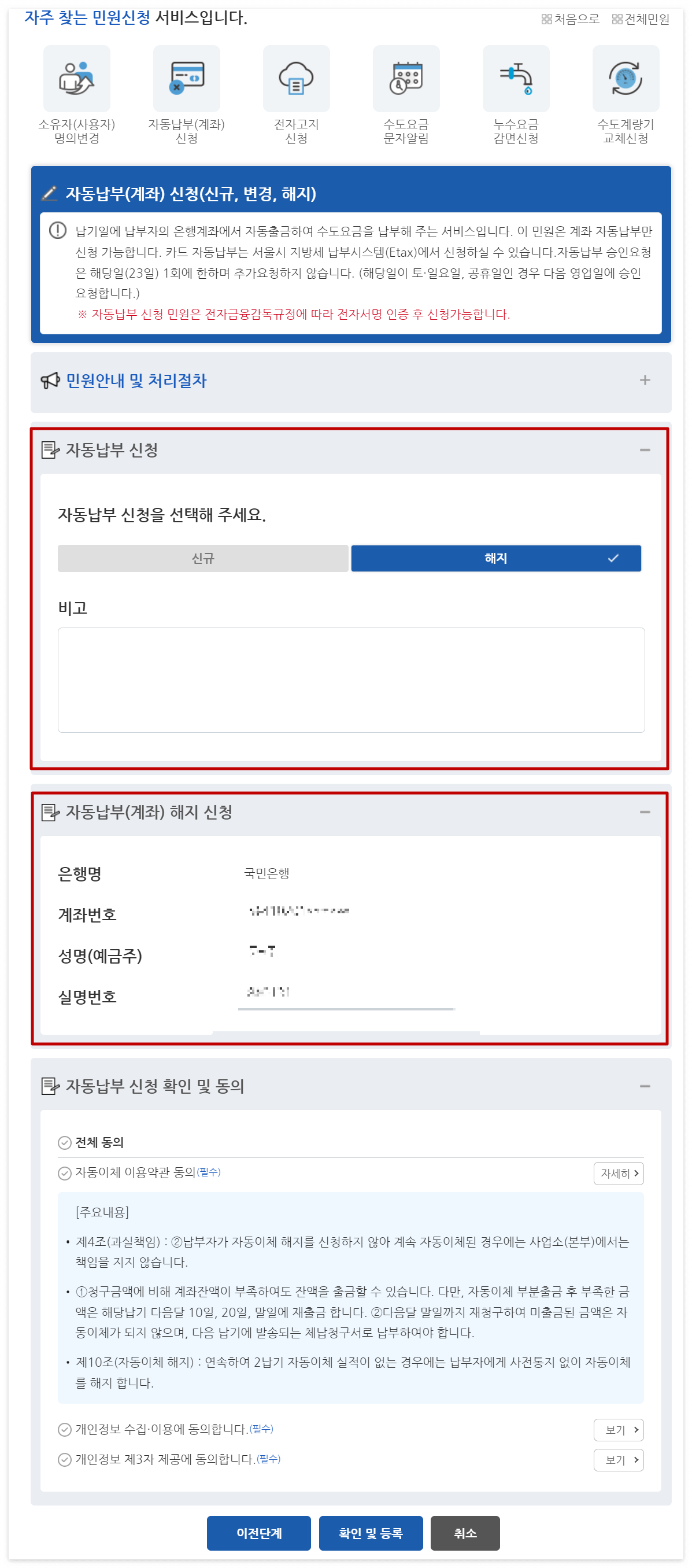납기일에 납부자의 은행계좌에서 자동출금하여 수도요금을 납부해 주는 서비스입니다. 신청/해지방법 자동납부(계좌) 신청/해지방법표 - 신청/해지경로 (방문신청, 인터넷신청, 보이는 ARS신청)