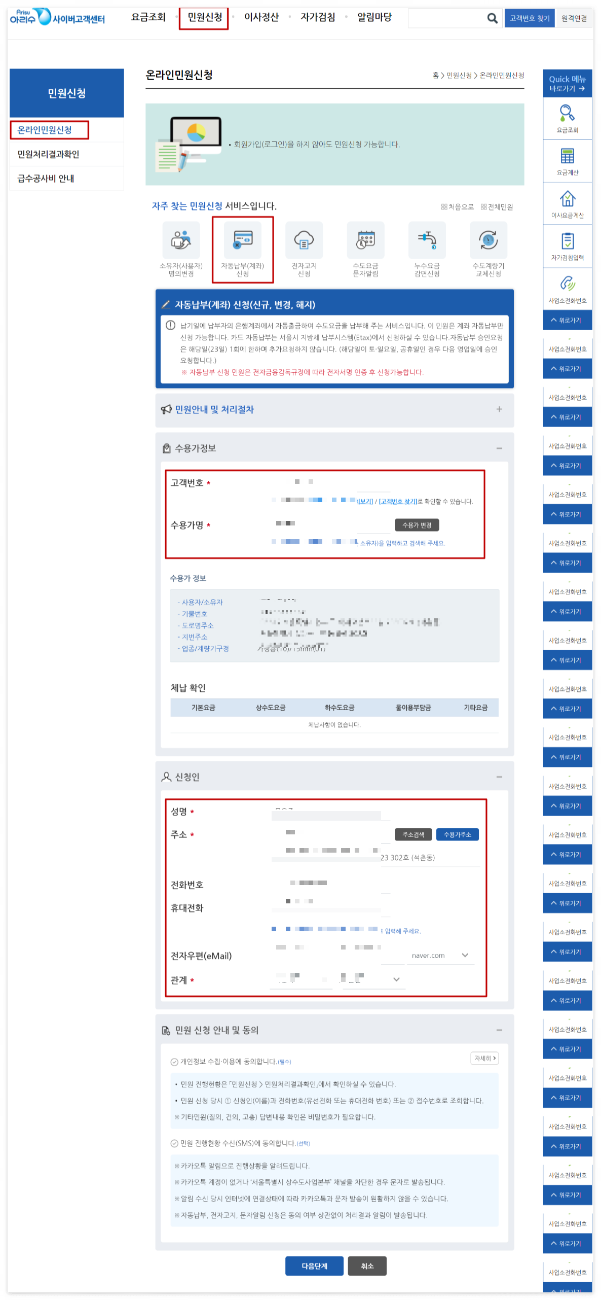 아리수 사이버고객센터 > 요금조회 > 요금납부방법 > 자동납부(계좌)