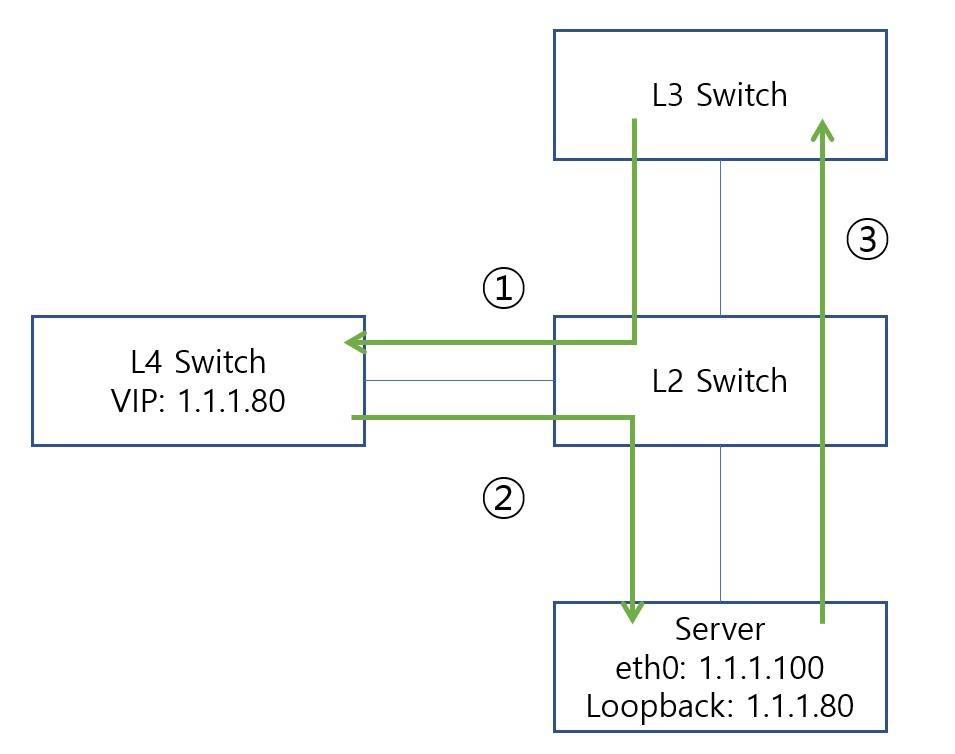 해당 단어를 사전에서 검색해보면 "외팔", "한팔" 이라는 뜻을 가지고 있다. https://en.dict.naver.com/#/entry/koen/0a3b5332d53b4f2ab0216df59672a510 단어 뜻 그대로, L4 스위치가 네트워크 스위치에 하나의 케이블만, (LACP/Trunk 등으로 구성되었다면) 하나의 데이터회선만 연결하여 구성하게되며, 구성도로 보았을 때 "외팔" 모양을 하게된다. One Arm 방식의 네트워크 구조 및 구성방식, Traffic Flow 등을 확인하면 크게 3가지 정도로 구분할 수 있다. 1. DSR 구성 Direct Server Return의 약자로, "Server가 Client에 직접 트래픽을 돌려준다"는 의미이다. 과거에는 L4스위치에서 Request/Resp..